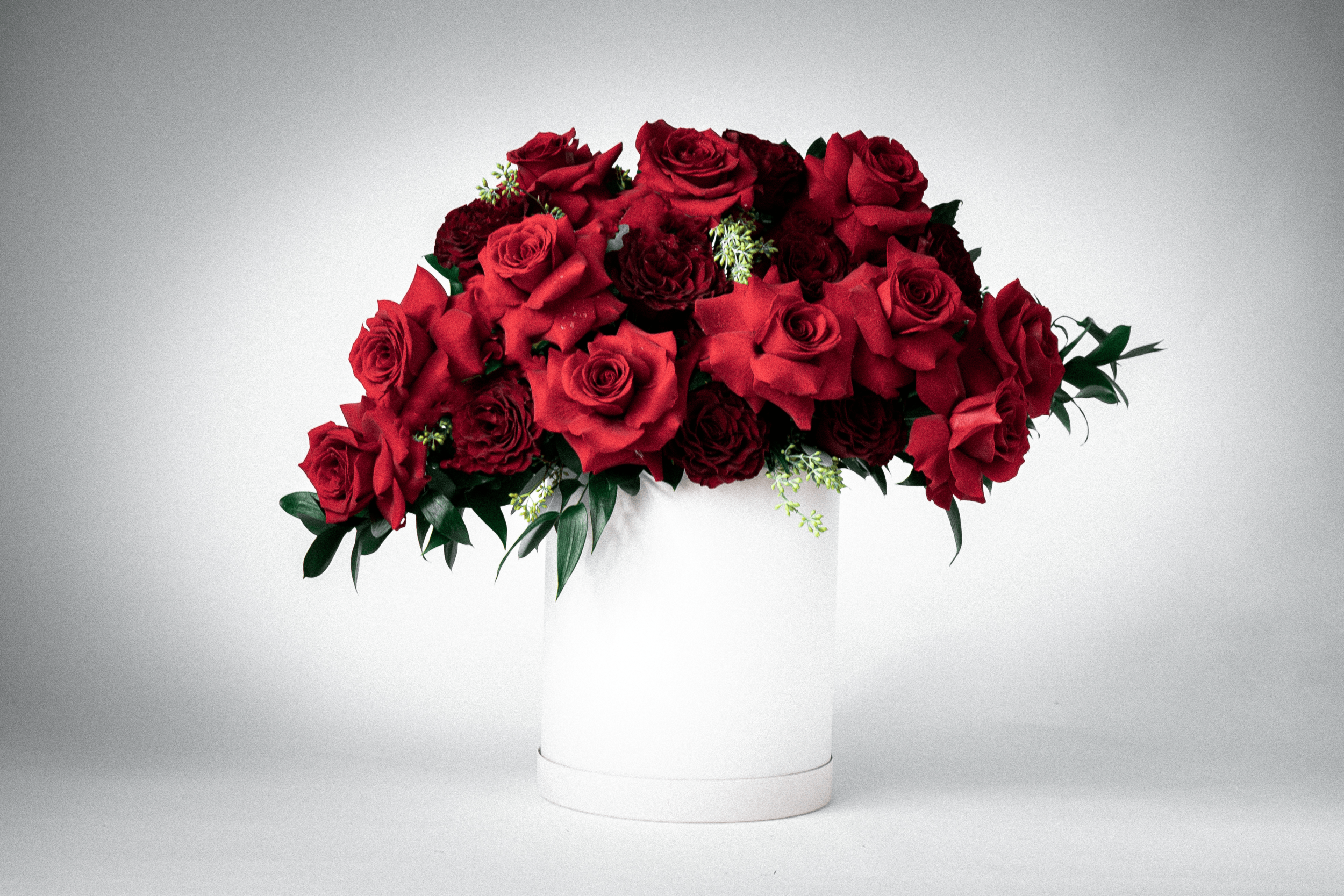 Our deluxe Rosé Blooming bouquet box relies on modern artistry to reinvent a classic symbol of love and romance. Statuesque in its height and presence, this hand-crafted box emanates its richness through its blush hues. Our Bright, bold red premium roses are stand out against this tint.